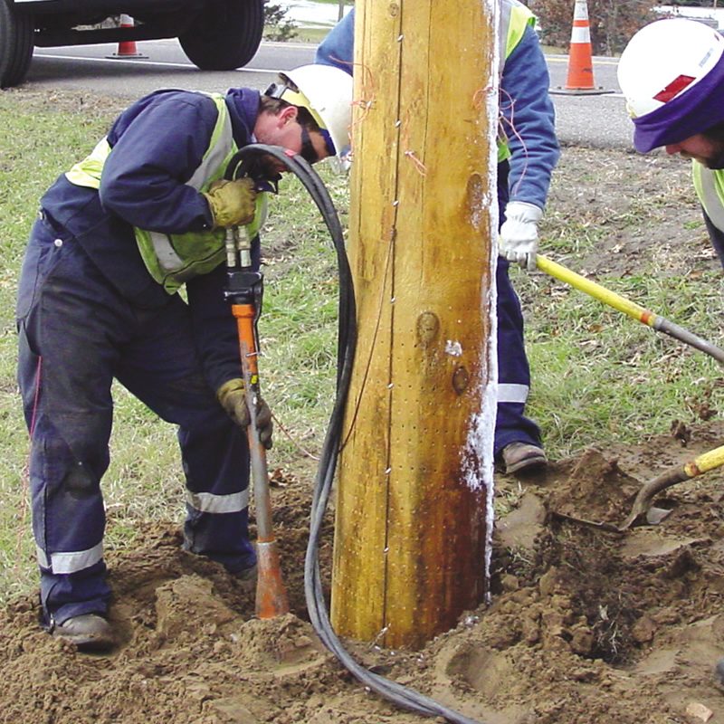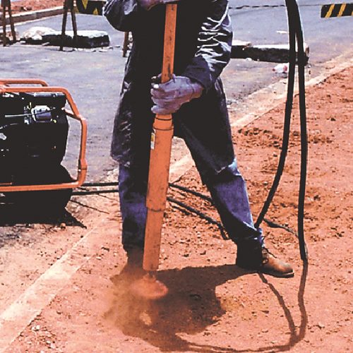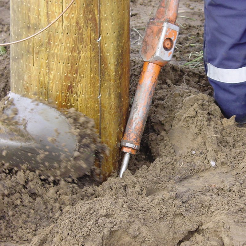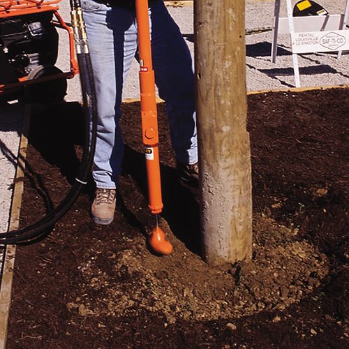 油圧の力で毎分1600回の締固めが可能。電柱やポールの周囲に埋め込んだ土砂に用いて土固めをすることで、よりしっかりとした建柱が行えます。標準仕様の瓜型シューは円柱に適した形状のため、均一な土固めが可能です。ON-OFFバルブハンドルは握りが細く、トリガーはロックができるなど、操作性にも配慮した設計です。内部の稼働部品が2点と非常に少なく、メンテナンスフリーで長期間使用できます。また、油圧で駆動するため排気音が発生せず、夜間作業にも適しています。