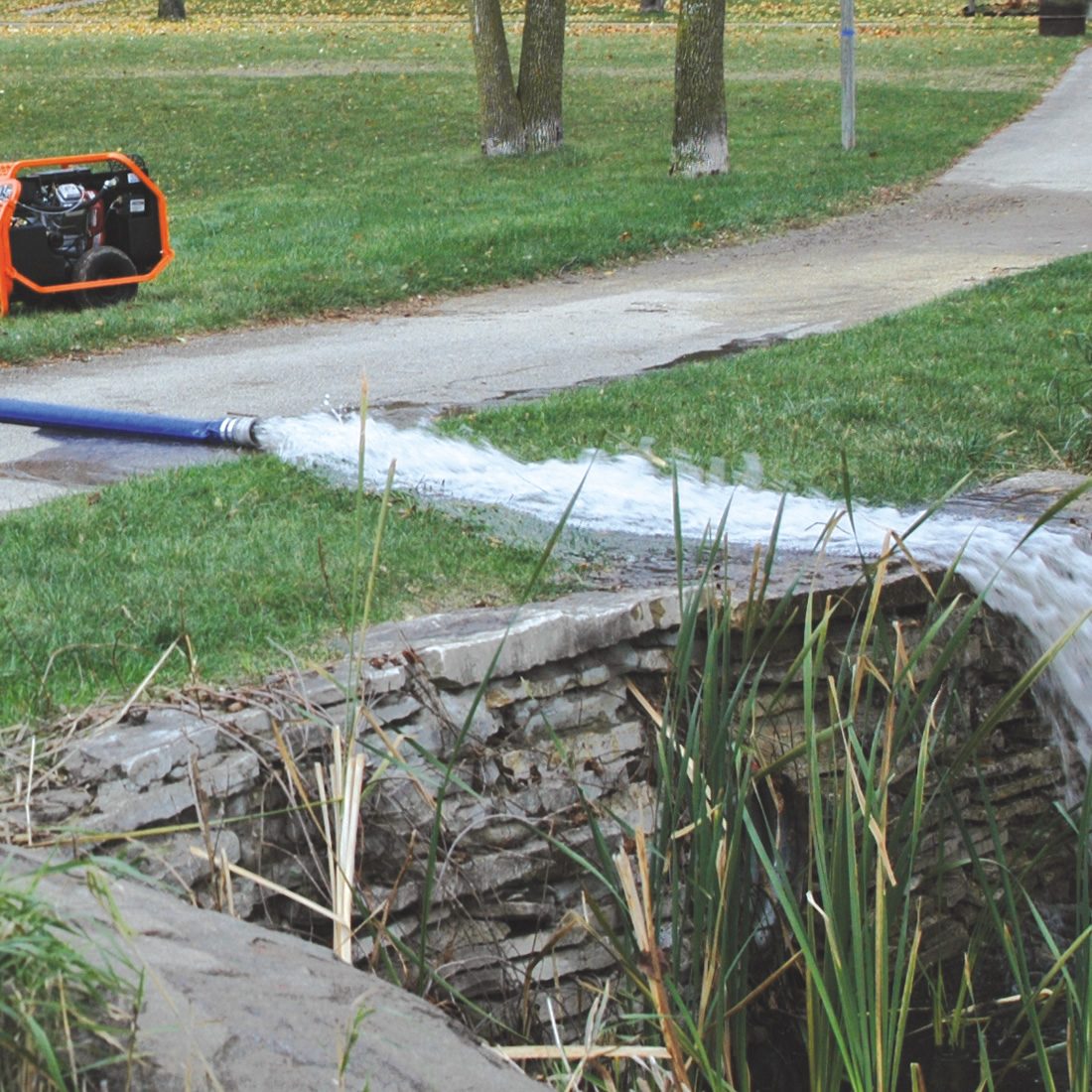 小型とはいえ、最大排出量は950L/分、最高揚程40mと実力は十分。水中に沈めて使用することができ、吸水スクリーンを通過する直径8mmまでの小石などは水とともに排出します。電気モーターを動力とするものと違い、空転させても焼き付く心配がないのは油圧式の大きな利点です。