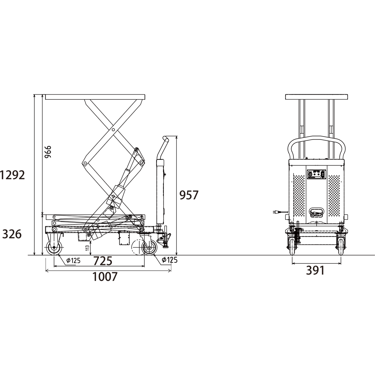 PLM100Wは耐荷重100kg、1293mmまでリフトアップできるWシザー高リフトタイプです。