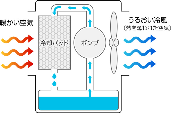 気化熱を利用しているため、省電力なうえ冷風効果が得られます。